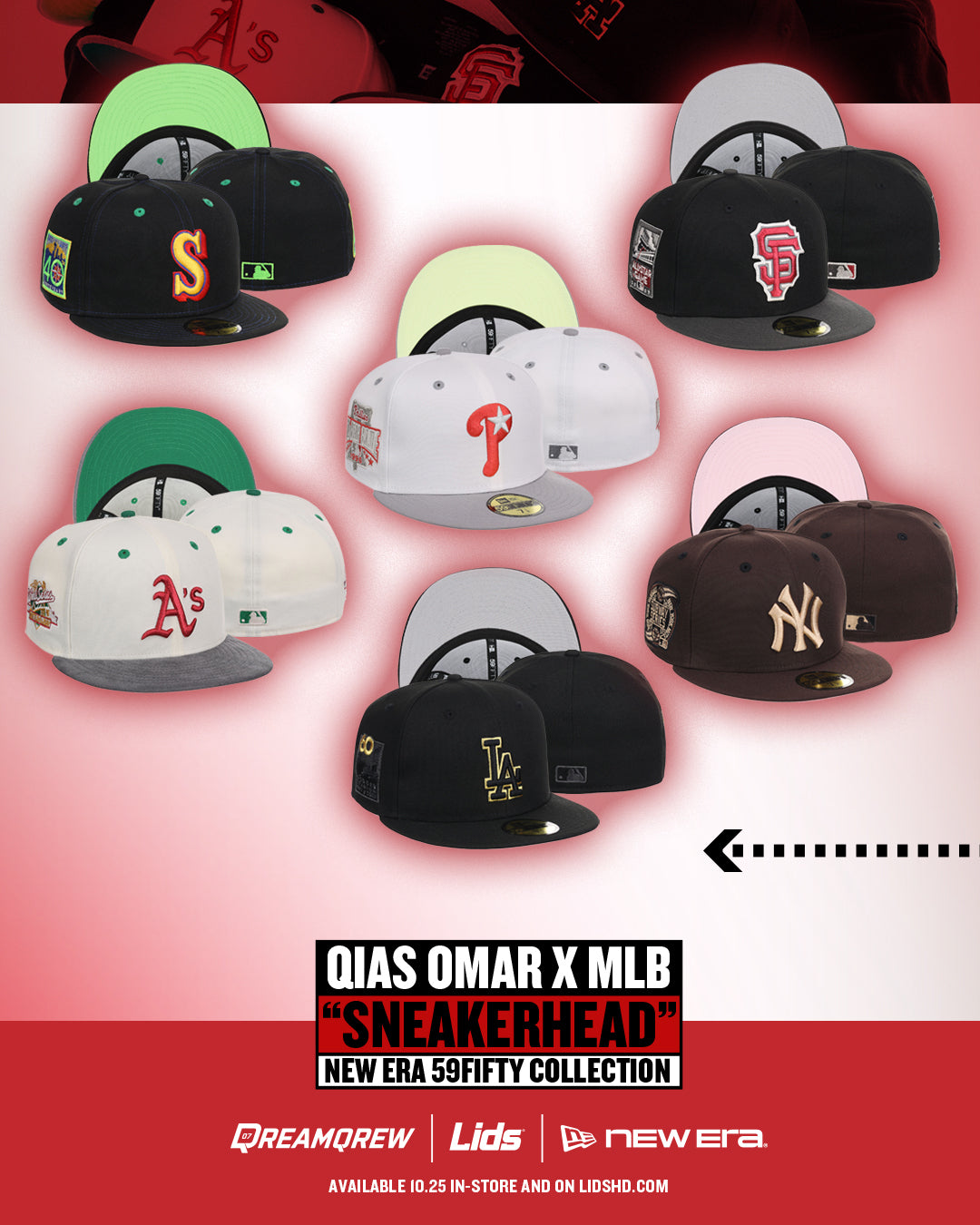 The Qias Omar x MLB “Sneakerhead” 59FIFTY Collection reimagines six iconic MLB teams through the lens of sneaker culture. Inspired by the grail sneakers that defined Qias’ journey as a creator, each hat features premium touches like suede fabric, glow-in-the-dark embroidery, and reflective paneling.